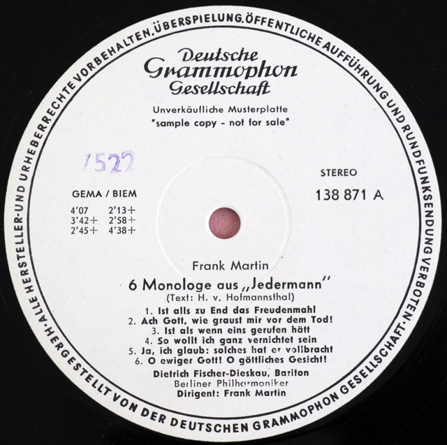 レーベル 白レーベル(テストプレス) レーベル(2面)に「Ungeprueftes Muster」(未承認マスター盤)のゴム印あり。