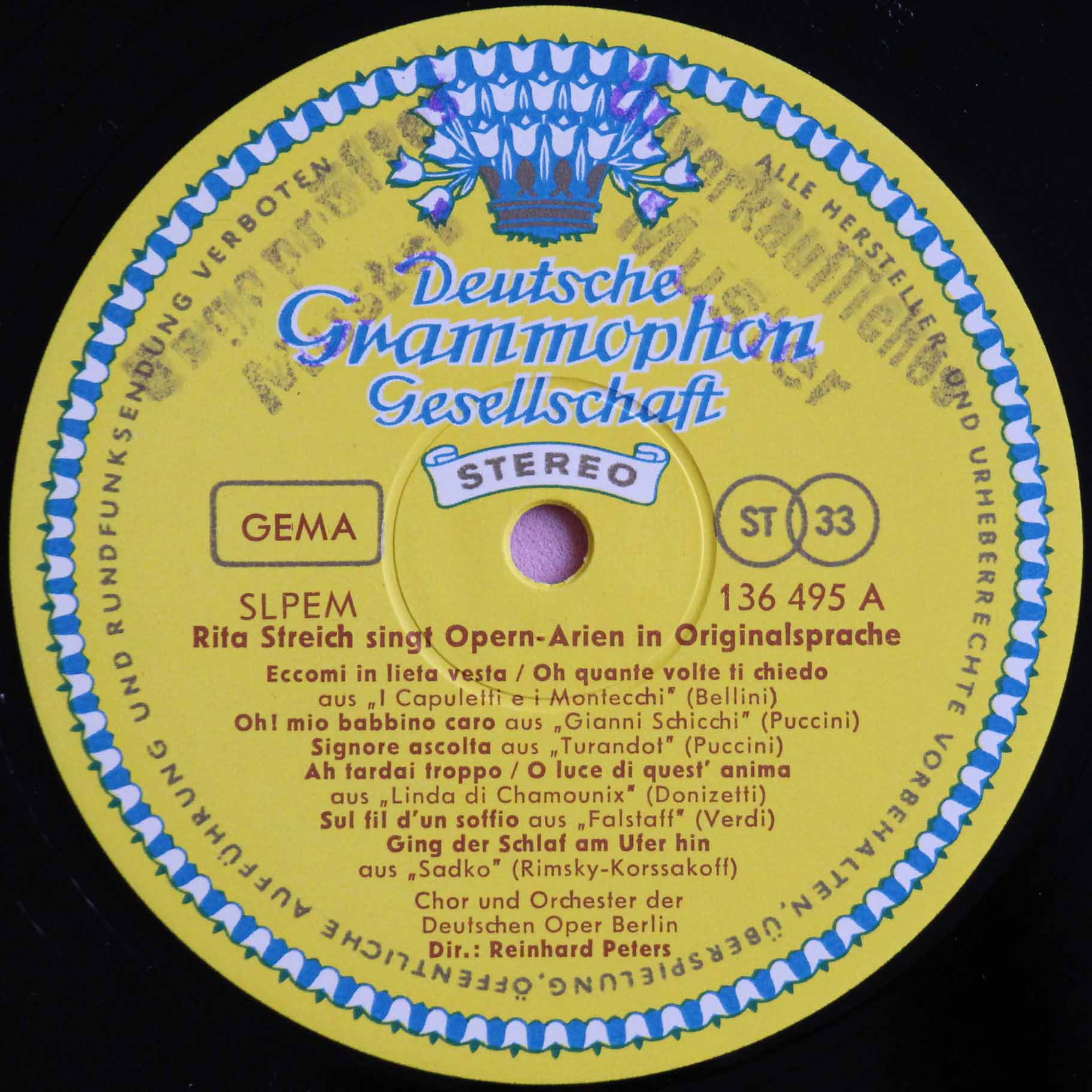 レーベル  チューリップレーベル レーベルに「Ungeprueftes Muster」(未承認マスター盤)、「Unverkaeufliche Muster」(非売品マスター盤)のゴム印あり。