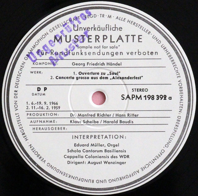 レーベル 白レーベル(テストプレス) 1面に「Ungeprueftes Muster」(未承認マスター盤)のゴム印あり。